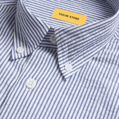 Une chemise classique bleu clair à rayures en Seersucker 100% coton. L'effet naturel de froncement du tissu vous donne de la respirabilité et de l'aération, imbattable pour les temps chauds.