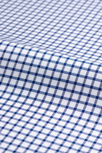 Flannelstof med marineblå bund og orange rudemønster. Den børstede overflade giver en blød og isolerende effekt. Fremstillet i 100 % bomuld.