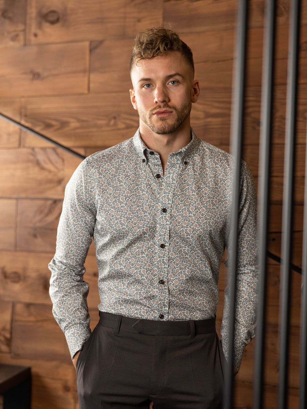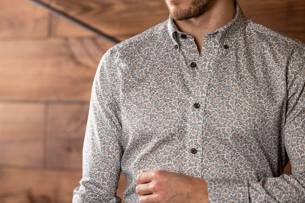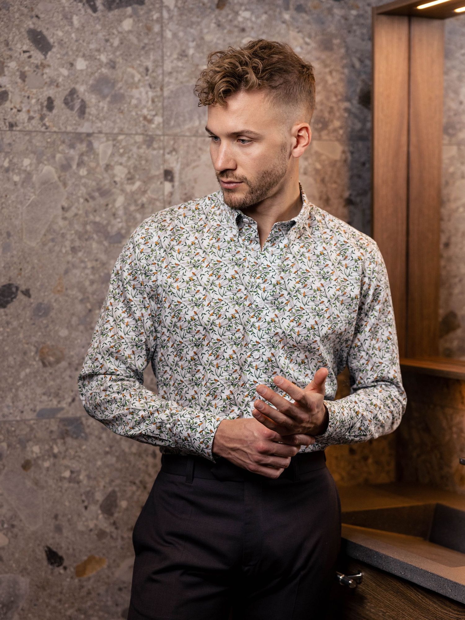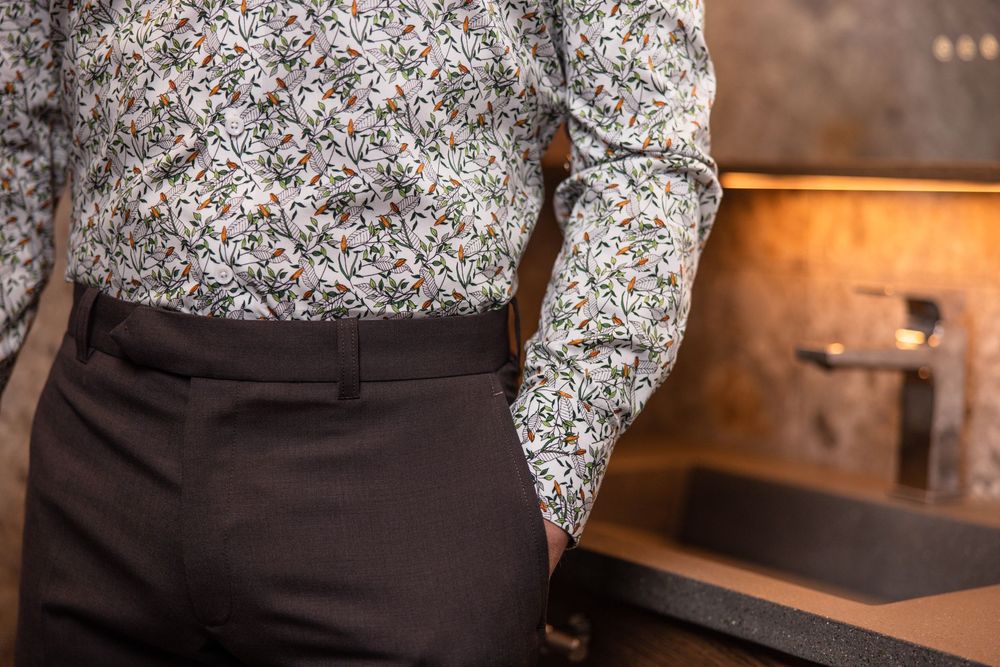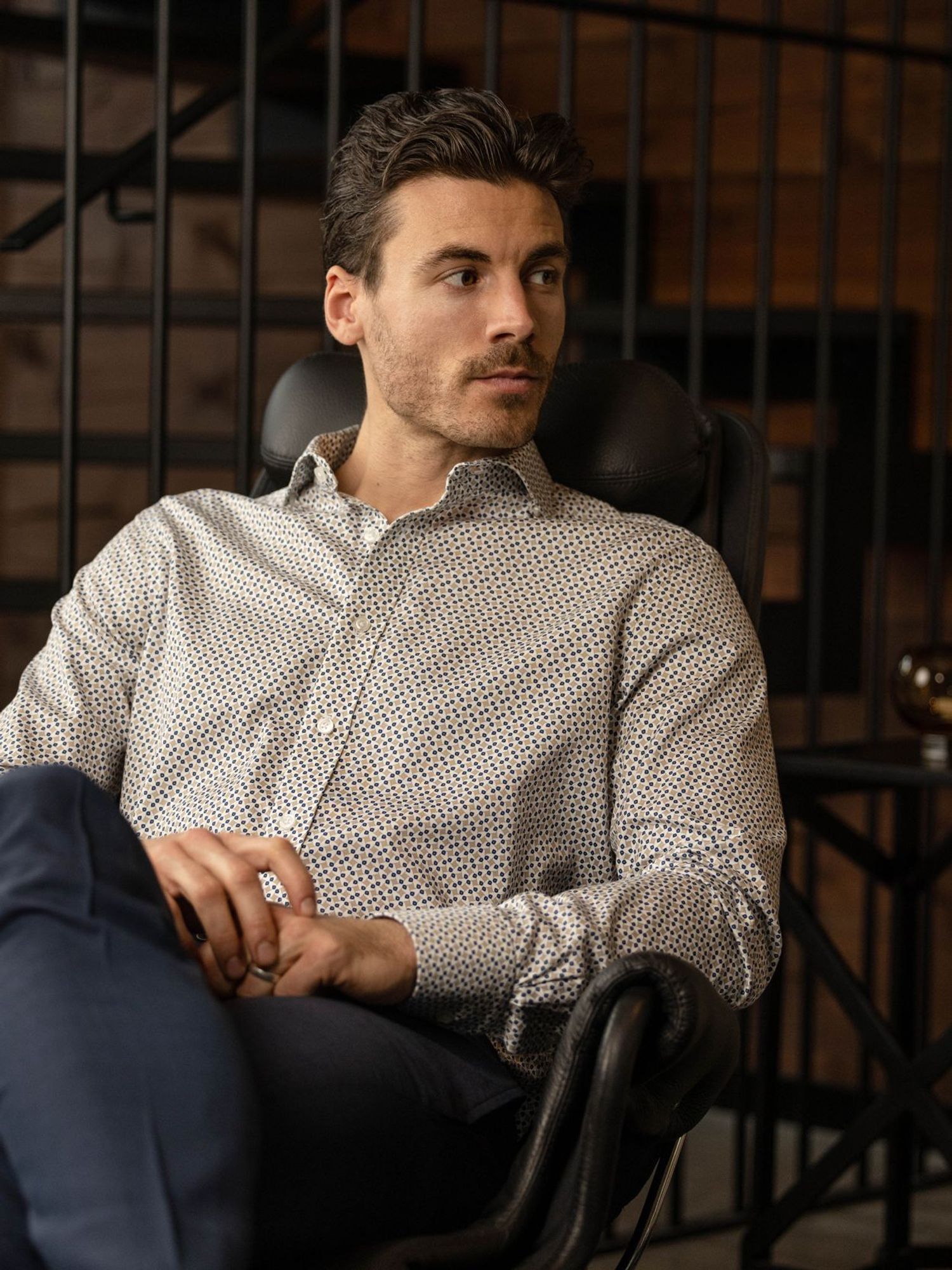 “We proudly present our 70’s inspired limited edition print collection featuring geometrical and organic patterns. The collection boasts a sophisticated color palette and maintains a touch of modernity. The various prints range from bold to soft and subdued. I recommend pairing these shirts with a stylish brown suit to add some personality to your wardrobe. This combination is a perfect alternative to the otherwise strict black or gray suit and is an excellent choice for a spring casual business outfit."