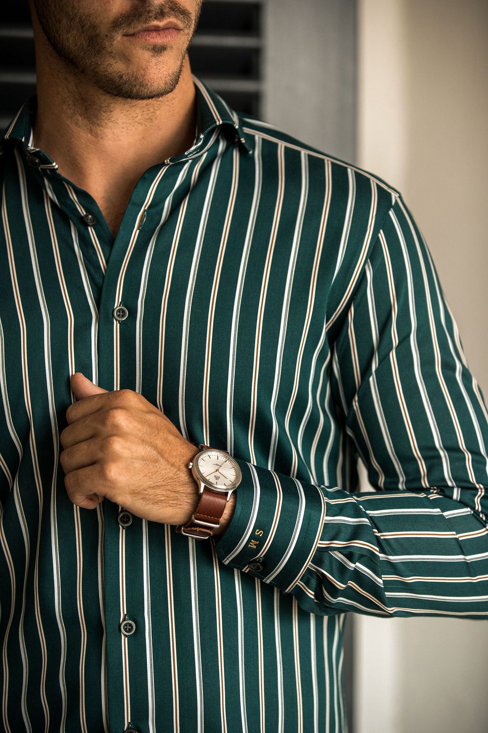 Mörkare färger gör sig helt rätt till den kommande säsongen, inte minst kulörer åt det gröna hållet. Den starka och samtidigt lugna färgnyansen ger möjlighet åt flera olika stilar och kan stylas in i det oändliga. Ränder i kombination med grönt är ett helrätt inslag i skjortor denna säsong, och funkar lika bra under kostymen som till dina favoritbyxor.